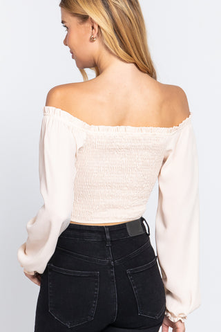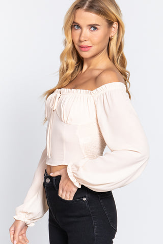 Imported S.M.L LONG SLEEVE OFF THE SHOULDER WITH RUFFLE BACK SMOCKING DETAIL WOVEN TOP 100% Polyester Cream ACT