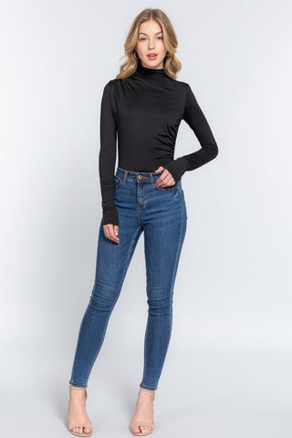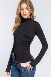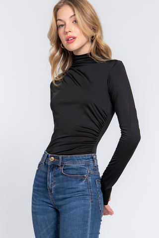 Imported S.M.L LONG SLEEVE HIGH NECK SHIRRING DETAIL ITY KNIT BODYSUIT 95% Rayon 5% Spandex�� Black�� ACT