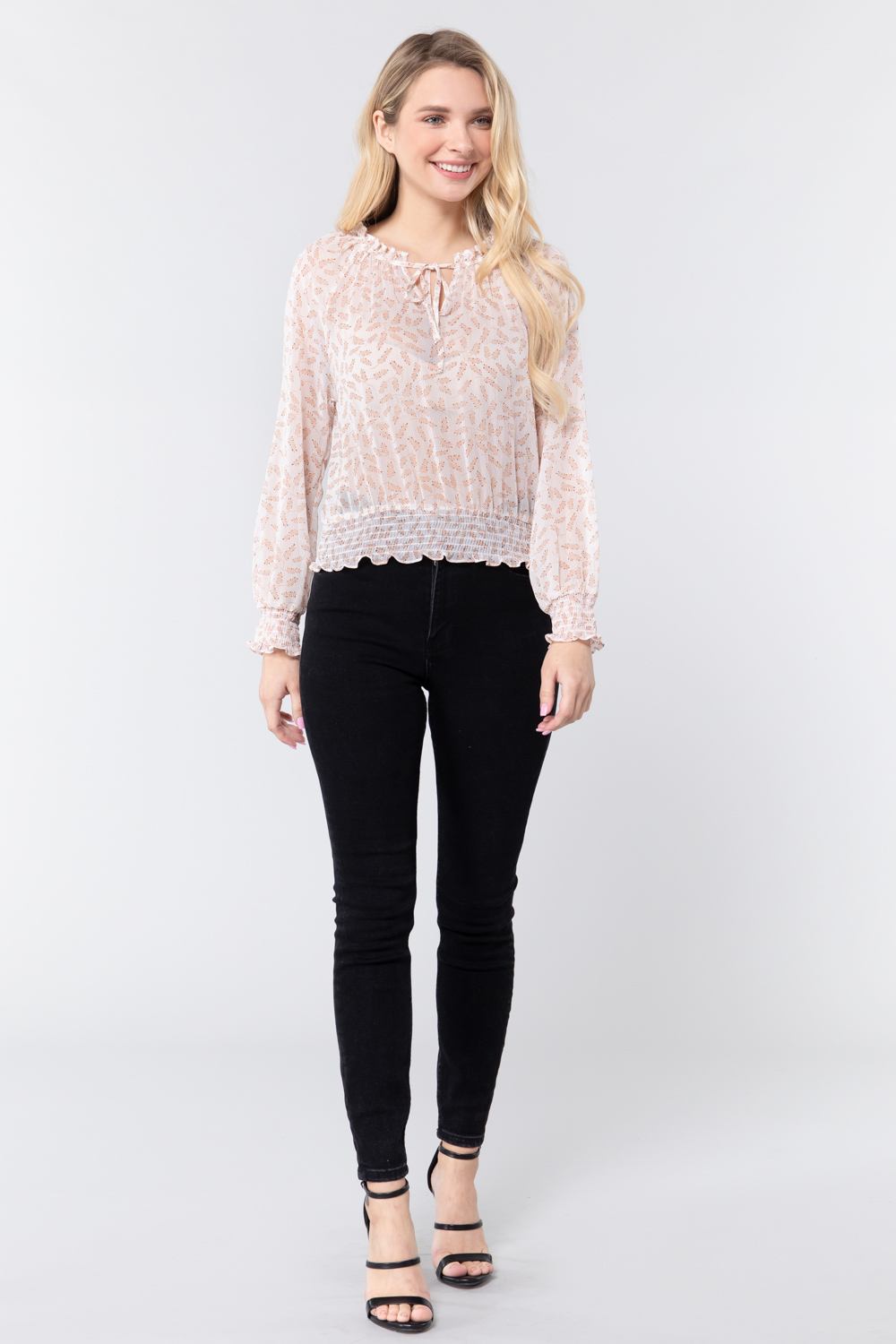 Imported S.M.L LONG SLEEVE FRONT TIE DETAIL SMOCKED HEM PRINTED WOVEN TOP 100% Polyester Off White ACT