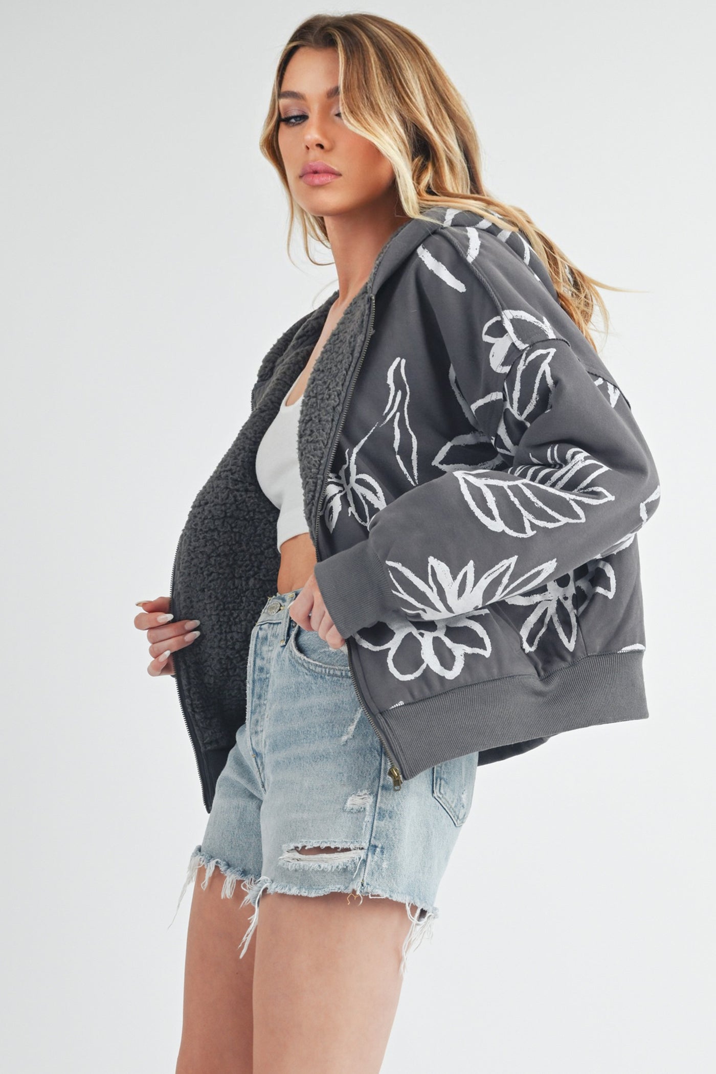 The flower print zip-up Sherpa hoodie is a cozy and stylish piece perfect for adding a touch of floral beauty to your wardrobe. Featuring a soft Sherpa material for warmth and comfort. The zip-up design allows for easy wear and versatility in styling. The flower print adds a feminine and charming element to your casual look.