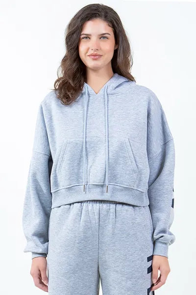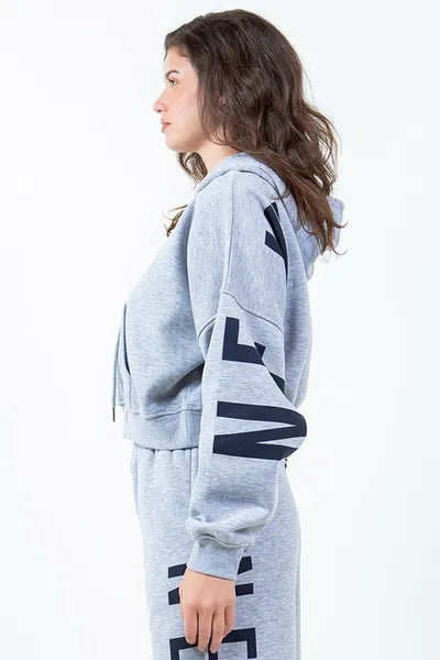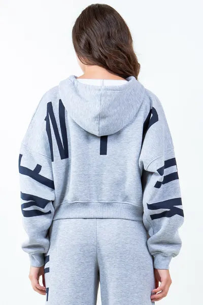 American Bazi Letter Graphic Long Sleeve Drawstring Cropped Hoodie - H.GREY/NAVY / S