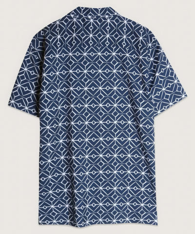 Add a touch of contemporary flair to your wardrobe with our Geo Print Camp Shirt in classic Navy. Shop now and elevate your style with ease!