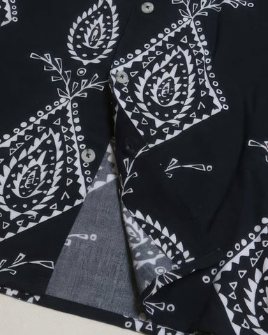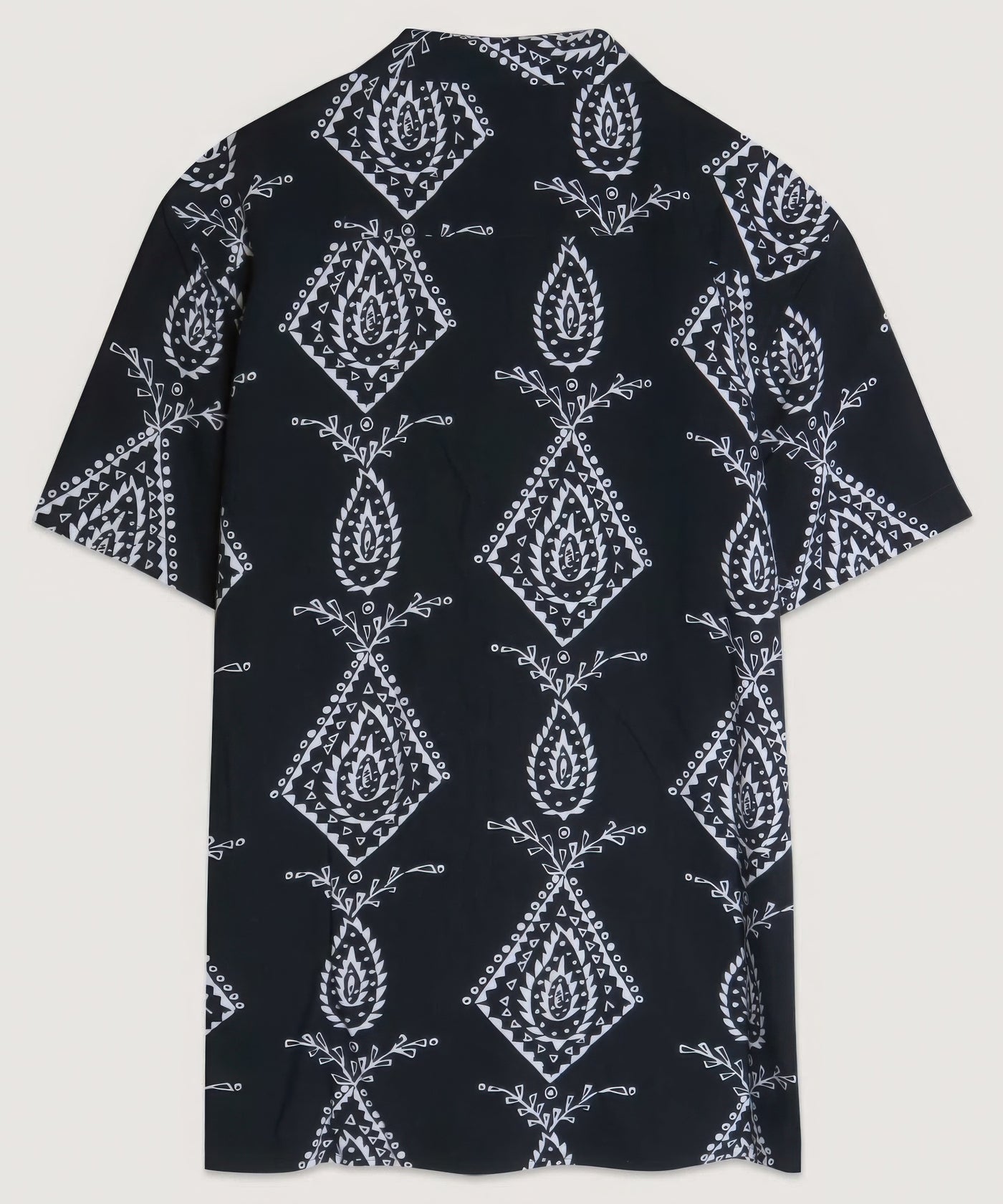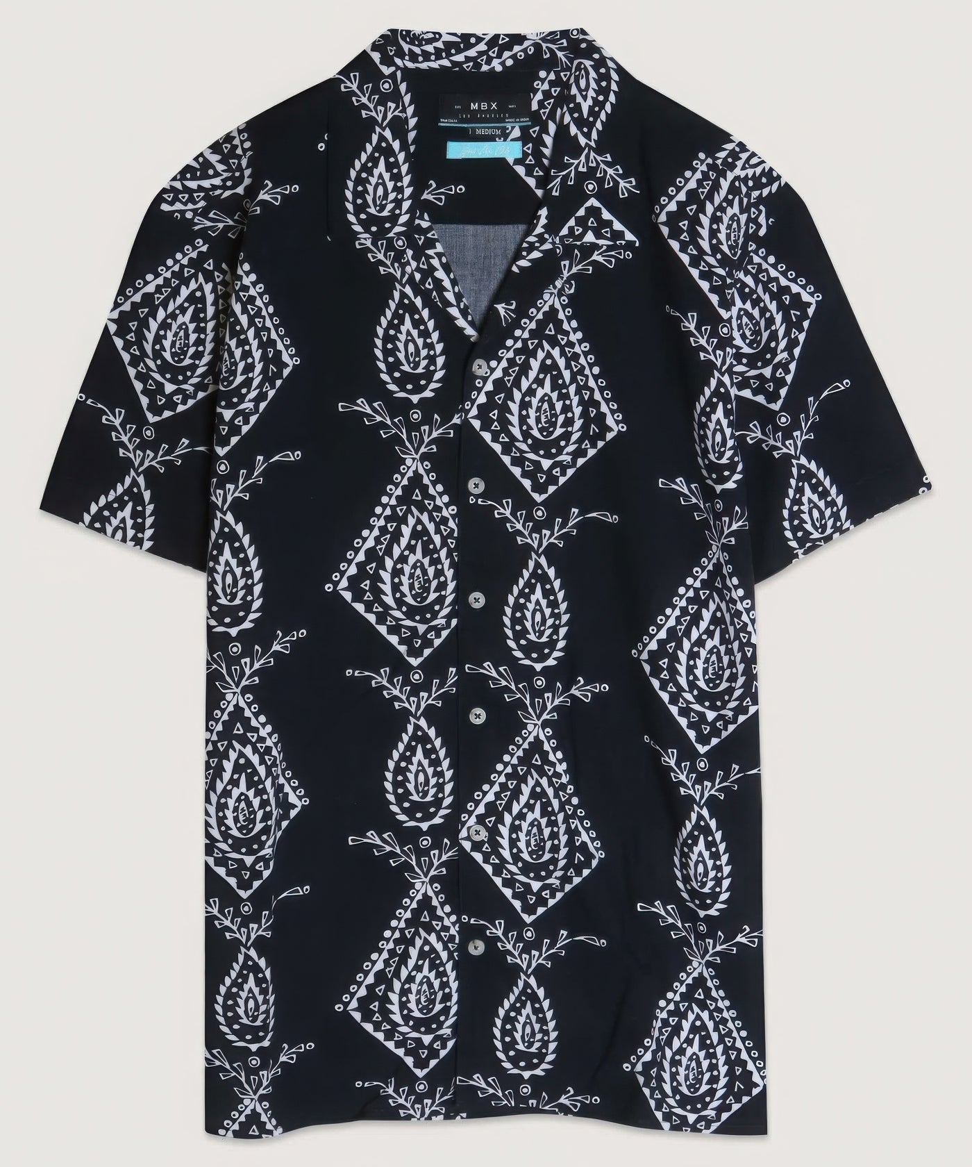 Key Features: - Fabric: 100% Viscose, providing a lightweight and breathable feel. - Fit: Regular fit that offers comfort and ease of movement. - Color Options: Dress Blues. - Sizes: Available in S, M, L, and XL. - Design: This shirt features an all-over boho print (AOP) that adds a unique and stylish touch. The classic camp collar and button-down front make it versatile for various occasions. - Versatile Styling: Ideal for casual outings, beach days, or adding a bohemian flair to any outfit.