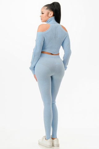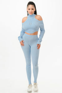 Elevate your style with our Knit Top & Pants Set, available in S, M, and L sizes. This set features a knitted rich rib fabric that provides both comfort and a touch of sophistication. The open shoulder, long sleeve crop blouse with a turtleneck adds a contemporary flair, while the stretch and skinny fit ensure a flattering silhouette. The pants feature a unique pantie design, completing the chic ensemble.