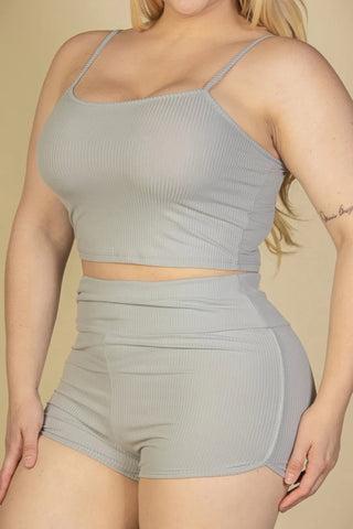 Plus Size Ribbed Cami Crop Top & Ruched Shorts Set