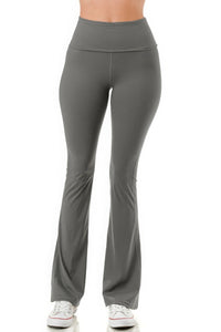 Elevate your yoga practice with our Folded High Waist Smooth Flare Yoga Pants in chic gray. Add them to your cart now and experience the perfect blend of style and performance!