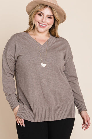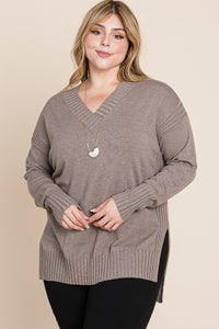 Plus Size Solid V Neck Buttery Soft High Quality High Low Two Tone Sweater Knit Top with Ribbed Detail and Side Slits