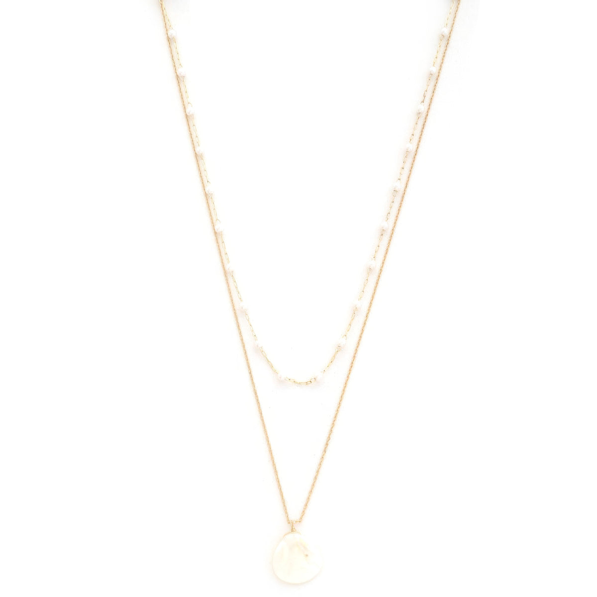 - Design: Pearl disc metal layered necklace with gold-tone metal chains.