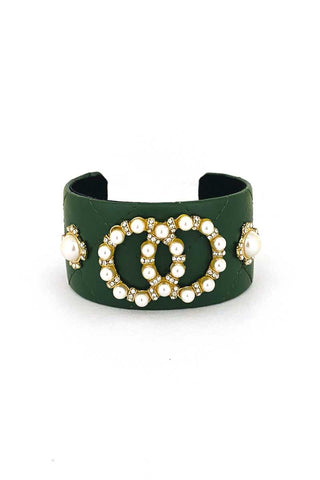 Imported FASHION PEARL DOUBLE ROUND STUDDED FAUX LEATHER CUFF BRACELET Black.Taupe.Green.Pink FBJ