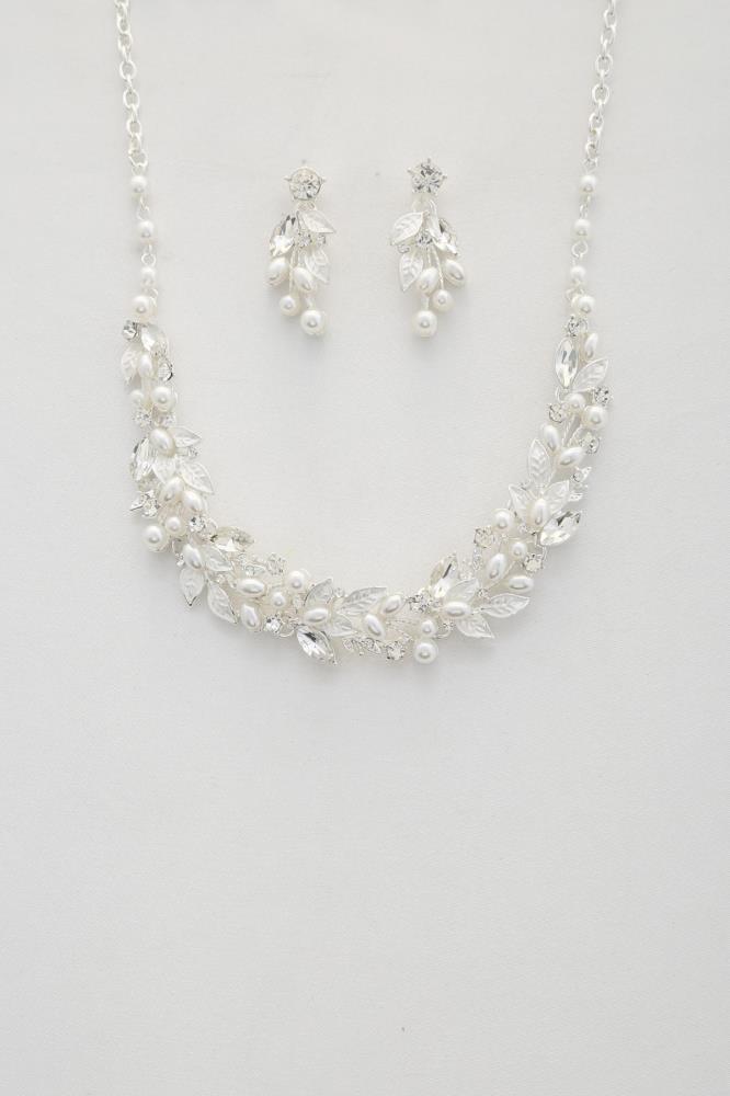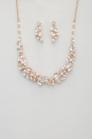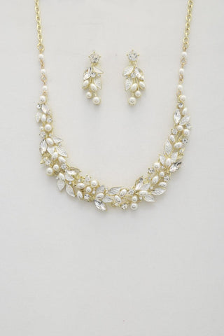 Imported LEAF PATTERN PEARL CRYSTAL NECKLACE Cream.Silver.Rose Gold FBJ