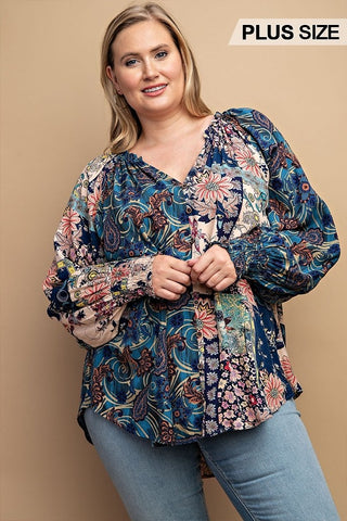 Elevate your style with the Mixed Print Front Button Long Sleeve Top in Midnight. Add this sophisticated piece to your cart now and embrace the perfect fusion of fashion and comfort!