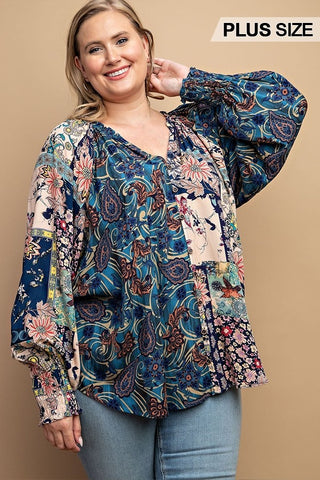 Indulge in the unique charm of mixed prints coupled with the stylish front button detail, making this top a standout choice for any occasion.