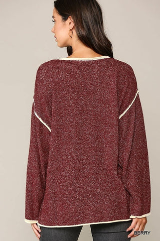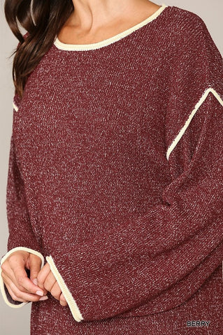 Imported S.M.L Two-Tone Sold Round Neck Sweater Top with Piping Detail 65% Acrylic 35% Nylon Berry GIG