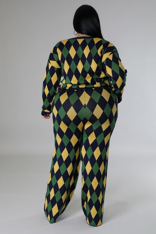 Imported 1XL.2XL.3XL Stretch pant set, V-cut, Long sleeves, Button closure, High-waisted pants, Elastic waistband. 70% Rayon 30% Nylon�� Green/Multi GOO