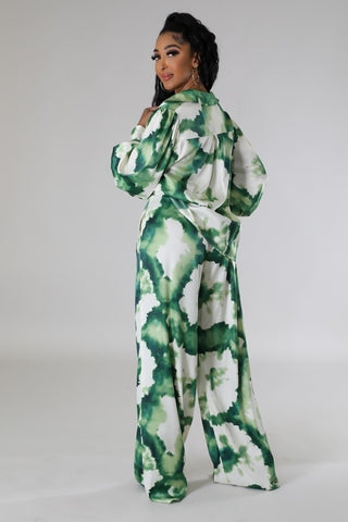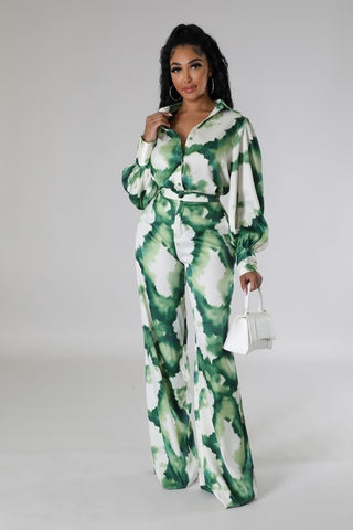 Imported S.M.L.XL Two piece set, Tunic top, Collar, Long sleeves, Button closure, High waisted pants, Pockets, Wide legs, Button zipper closure. 100% Polyester�� Green�� GOO