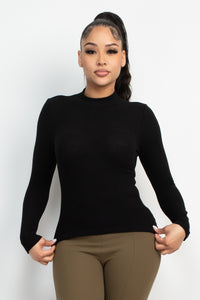 Imported S.M.L A knit fashion top featuring long sleeves, a mock neckline, and a fitted silhouette. 72% Rayon 24% Polyester 4% Spandex Black IRI
