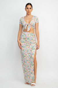 Front Knot Floral Top & Ruched Maxi Skirts Set