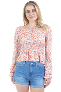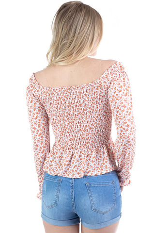 A knit ditsy floral printed crop top featuring long peasant sleeves, a square neckline, smock, can be worn off-shoulder, and a peplum hem.