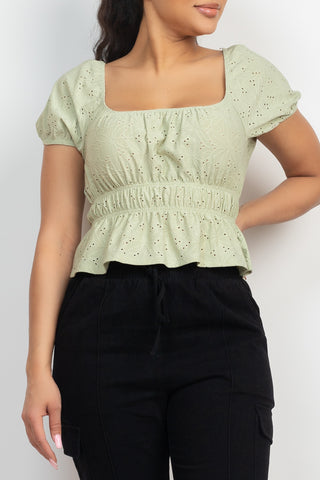A knit eyelet crop top featuring a square neckline, elastic waist, short puff sleeves, a peplum hem, and solid color
