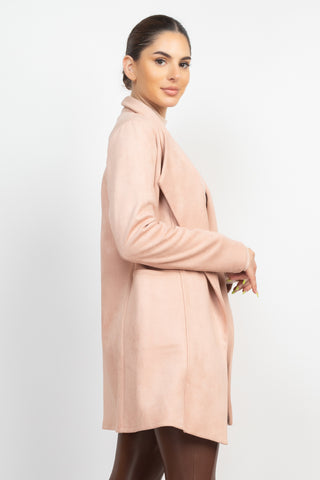 A woven faux suede blazer in a solid color featuring a notch collar, long sleeves, side pockets, and an open front.