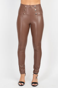 A pair of faux leather skinny leg casual pants featuring solid color, button-detailed front, a high-rise waist, and a full length.