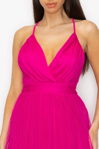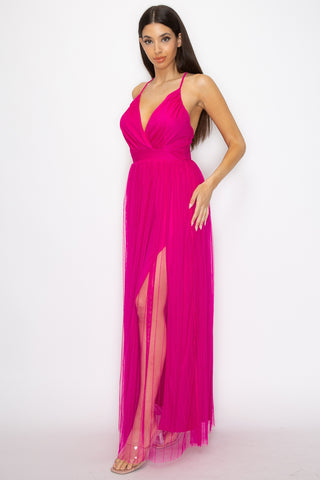 Pleated Mesh Slit Maxi Dress