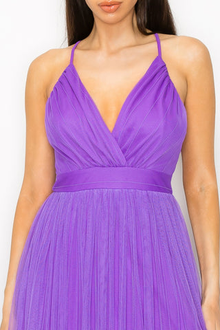 Pleated Mesh Slit Maxi Dress