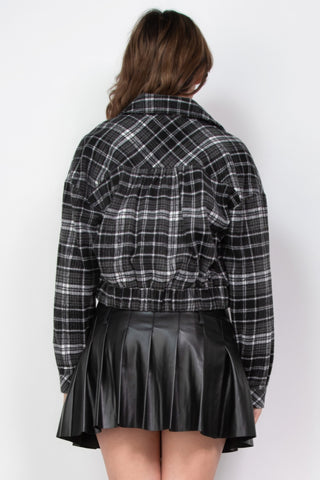 Add our Plaid Button-Down Crop Jacket in Black/White to your cart now and enhance your wardrobe with timeless style and comfort!