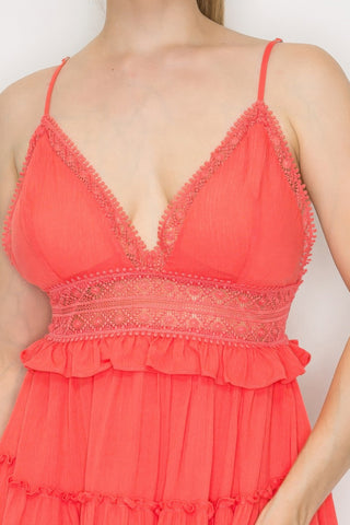 Add the Lace Tiered Open-Back Ruffled Dress in Coral to your wardrobe today and enjoy a perfect blend of femininity, comfort, and style!