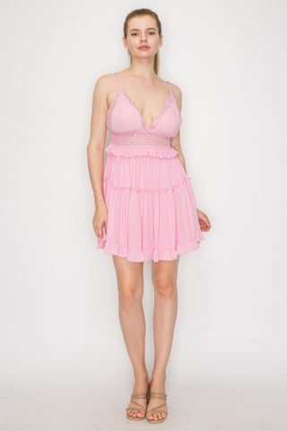 Add the Lace Tiered Open-Back Ruffled Dress in Baby Pink to your wardrobe today and enjoy the perfect mix of comfort, elegance, and femininity!