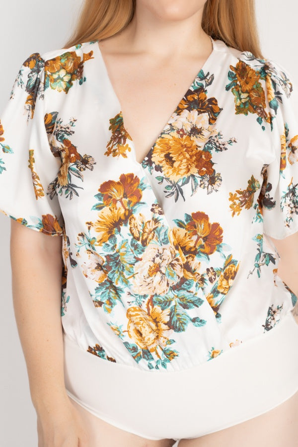Imported 1XL.2XL.3XL A satin woven bodysuit featuring an allover floral print, a V neckline with snap-button closure, short butterfly sleeves, a front wrap, and snap-button bottom closures. 100% Polyester Ivory IRI