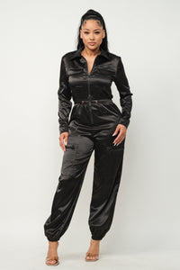 Satin Solid Front Zipper Side Pockets Detail Collared Long Sleeve Top And Elastic Waistband Tie Side Zipper Pockets Detail Jogger Cargo Pants Jumpsuit