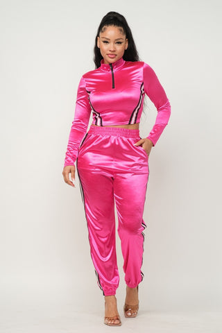 Casino Fabric Front Half Zip Up Color Block Stripes Detail Mock Neck Long Sleeve Cropped Jacket And Elastic Waistband Color Block Stripes Detail Side Pocket Jogger Pants Set