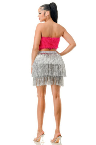 Make a bold entrance with our Fringe Metallic Skirt in sophisticated silver. Add it to your cart now and experience the perfect blend of glamour and sophistication!