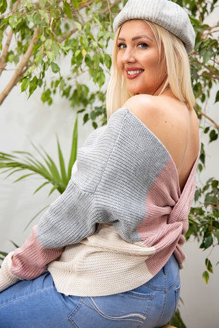 Imported1XL.2XL.3XLOpen Back Twisted Color block Print Long Sleeve Boat Neck Sweater Top100% Acrylic Grey/Mauve/White MAI