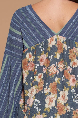 Made In U.S.A 1XL/2XL.2XL/3XL Floral printed knit top featuring long puffed sleeves, a v-neckline and striped yoke. 70% Polyester 26% Rayon 4% Spandex Denim ODD