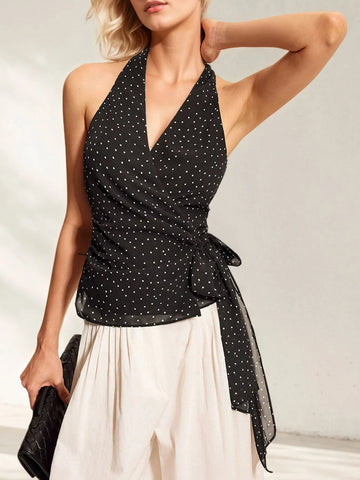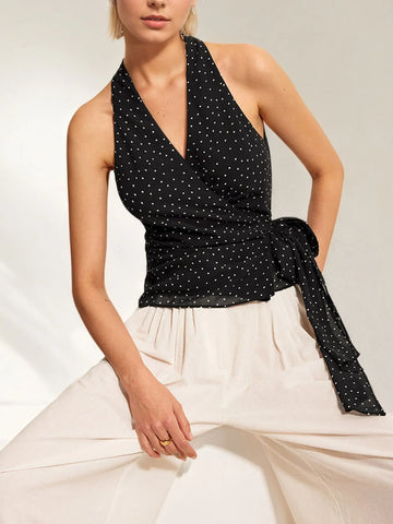 Inform when this item available: Polka Dot Halter Wrap Cami Top - Black / XS