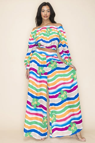 Enhance your wardrobe with our Off-Shoulder Top and Wide Pants Set in Multi. Perfect for embracing sunny days with style and comfort!