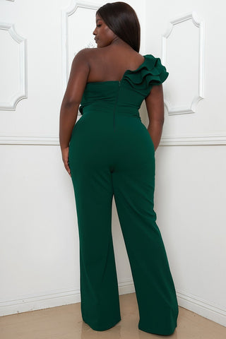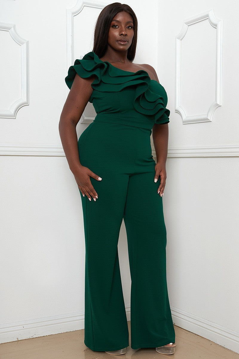 Imported 1XL.2XL.3XL LAYERED RUFFLE ONE SHOULDER PLUS SIZE JUMPSUIT.��BELL BOTTOM.��ZIPPER BACK.��MODERATE STRETCH 95% Polyester��5% Spandex Hunter Green�� SYM