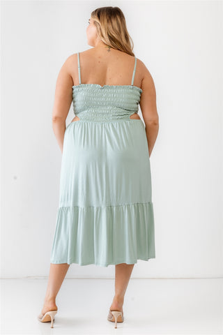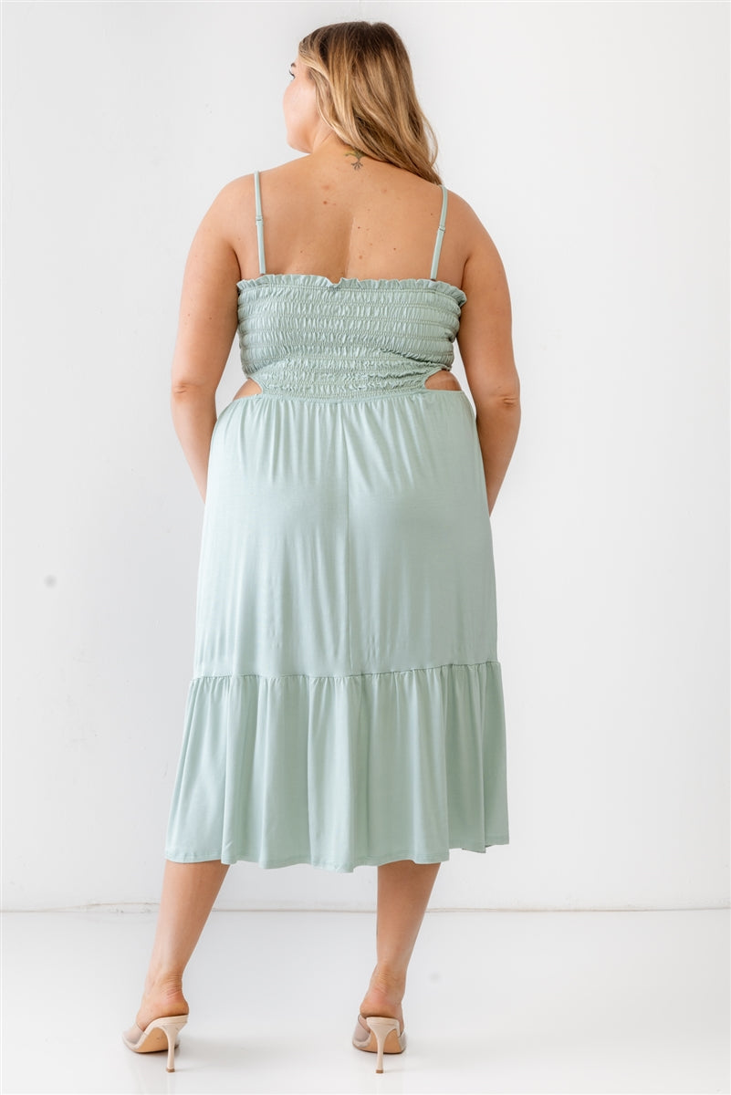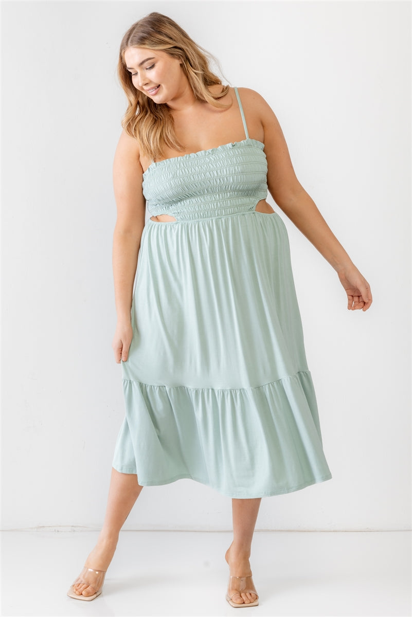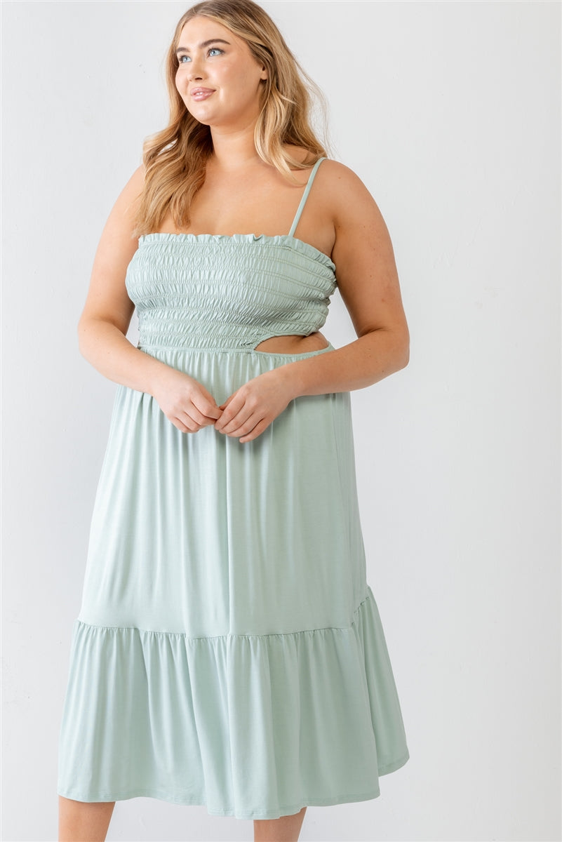 Made In U.S.A 1XL.2XL.3XL smocked, sleeveless, adjustable straps, ruffle trim, cut-out sides, flare hem, midi length, stretchy, unlined, non-sheer, cute, girlish, must-have, stylish 95% Rayon 5% Spandex Sage TSH