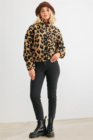 Imported S.M.L leopard print, fuzzy teddy knit, long sleeves, turtle neckline, front zip-up closure, two pockets, non-stretchy, unlined, not see through, casual, cute, warm, cozy, stylish, must-have 100% Polyester Mocha Leopard TSH