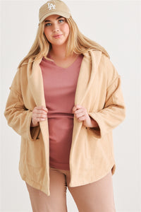 Imported 1XL.2XL.3XL solid color, open front, hooded, two pockets, long sleeves, dropped shoulders, super soft to touch, relaxed fit, non-stretchy, unlined, casual, cute, warm, cozy, robe style 100% Polyester Taupe TSH