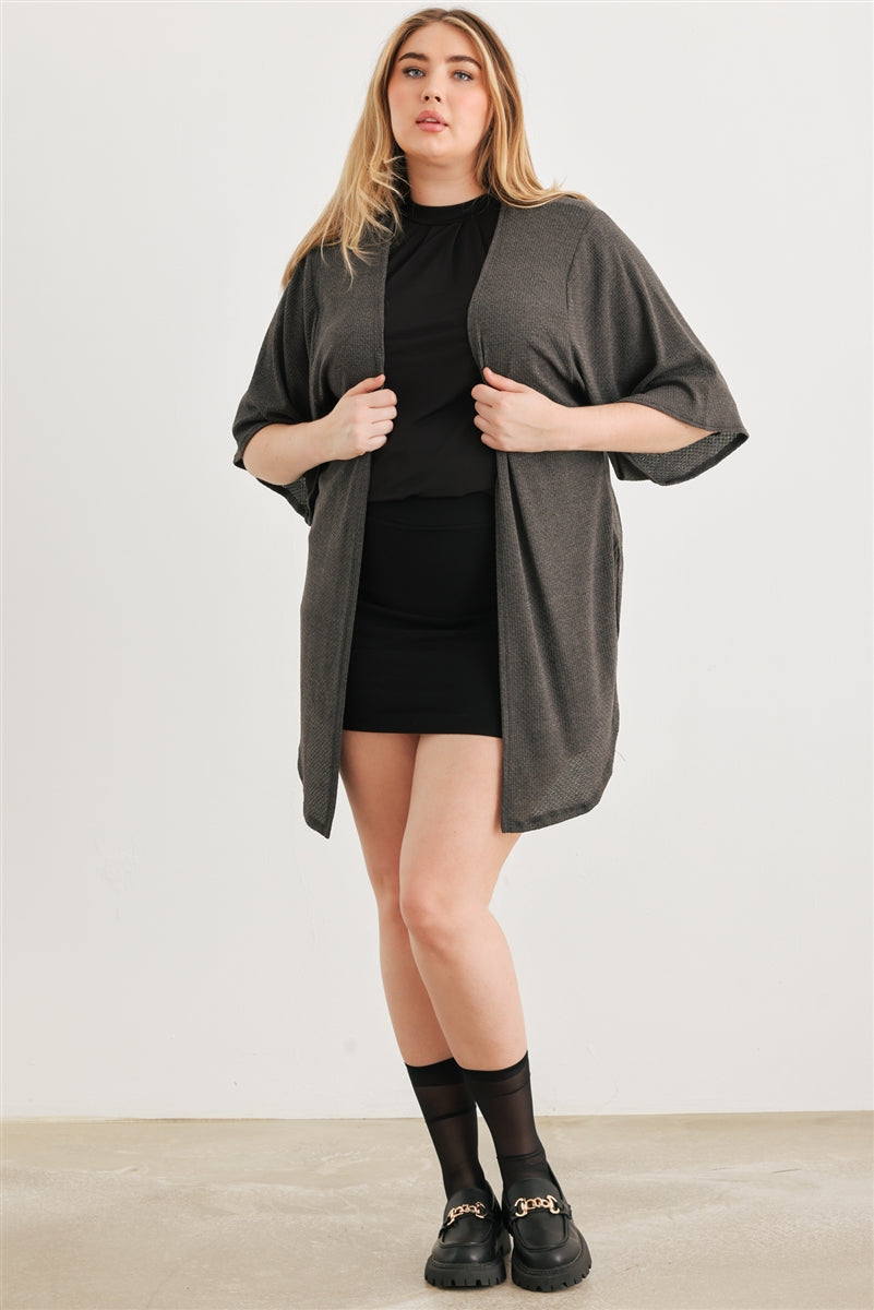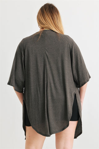 Imported 1XL.2XL.3XL Charcoal, solid color, knit material, open front, short sleeves, side slits, relaxed fit, semi-stretchy, unlined, not see through, casual, cute, cozy, cute 25% Rayon 70% Polyester 5% Spandex Charcoal TSH