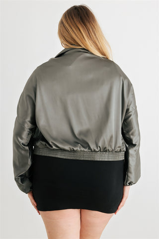 Plus Satin Zip-up Ruched Long Sleeve Cropped Bomber Jacket - 1XL