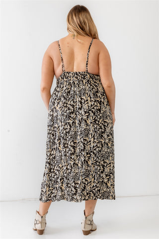 Imported 1XL.2XL.3XL floral print, v-neckline, smocked waist, sleeveless, straps, midi length, semi-stretchy, unlined, non-sheer, cute, girlish, trendy, must-have 100% Rayon Black TSH