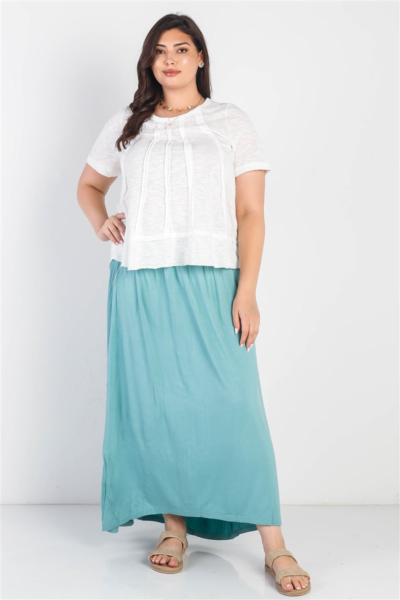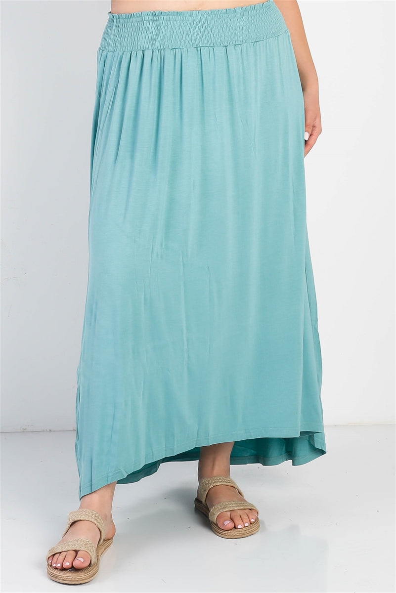 Imported 1XL.2XL.3XL Sage, solid color, smocked waistband, maxi length, high waist, relaxed fit, unlined, semi-stretchy, non-sheer, casual, cute, girlish 95% Rayon 5% Spandex Sage TSH