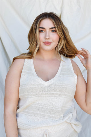 Imported1XL.2XL.3XLstriped, knit material, v-neckline, ribbed neck & hem, sleeveless top, elasticized waistband with adjustable drawstring, relaxed fit, semi-sheer, unlined, non-stretchy, casual, cute, comfy, boho vibe, summer look90% Polyester 5% Cotton 5% Spandex White TSH