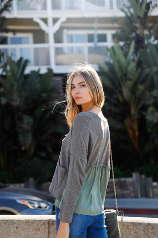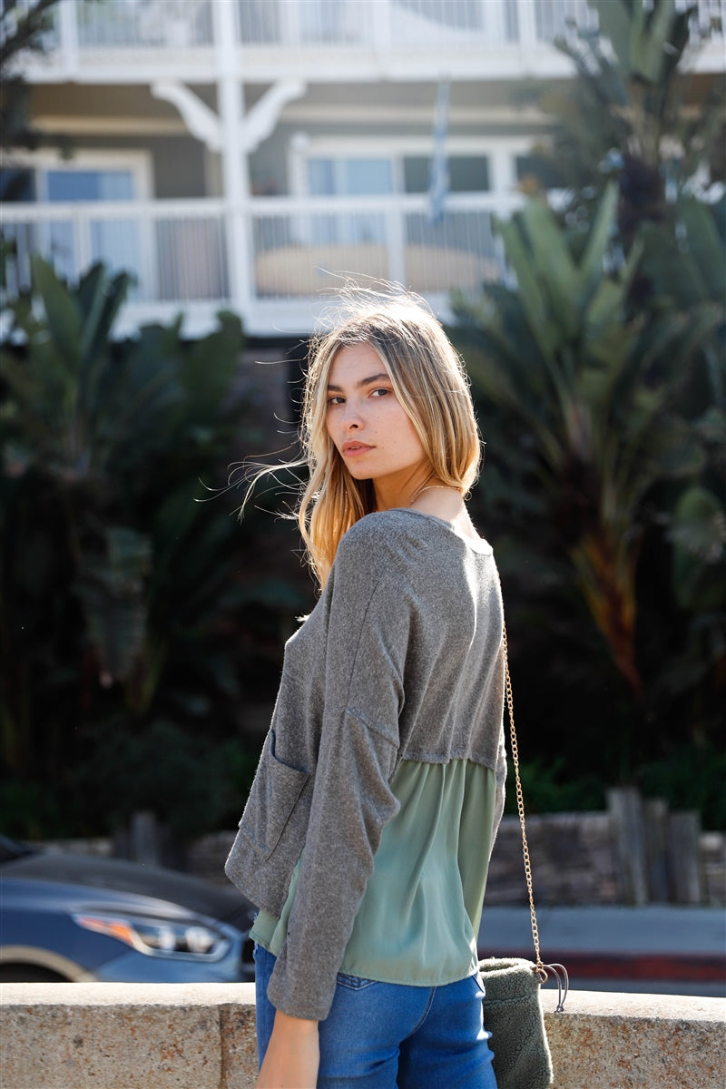 Grey & moss, long batwing sleeves, button front closure, chiffon layer at back, relaxed fit, two front patch pockets, casual, soft to touch, streetwear, stylish