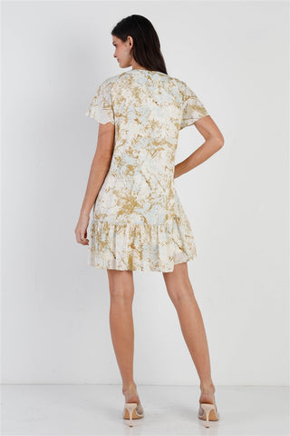 Imported S.M.L Olive & taupe, color paint print, short flare sleeves, ruffle hem, v-neckline with button up detail, relaxed fit, mini length, lined, non-sheer, non-stretchy, casual, cute, girlish, spring/summer look 100% Polyester Multi Olive Taupe TSH