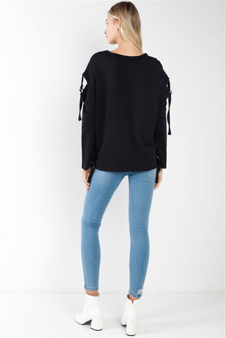 solid color, round raw trim neckline, long sleeves with cut-outs, dropped shoulders, double D strap detailing at shoulders and cuffs, relaxed fit, stretchy, casual, basic, warm, perfect everyday piece